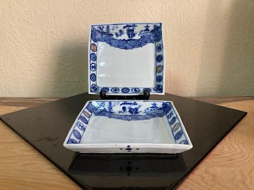 染付色絵山水丸紋角向皿
